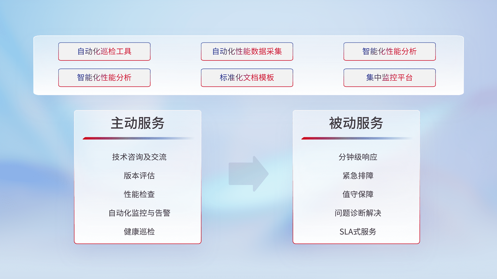 智能化工具和标准化文档,,,保障服务质量,,,,提供主动服务(包含技术咨询、、、版本评估、、、、性能检查、、、自动化监控与告警、、健康巡检)和被动服务包含(分钟级响应、、、、紧急排障、、、值守保障、、、、问题诊断解决、、、SLA服务)。。。