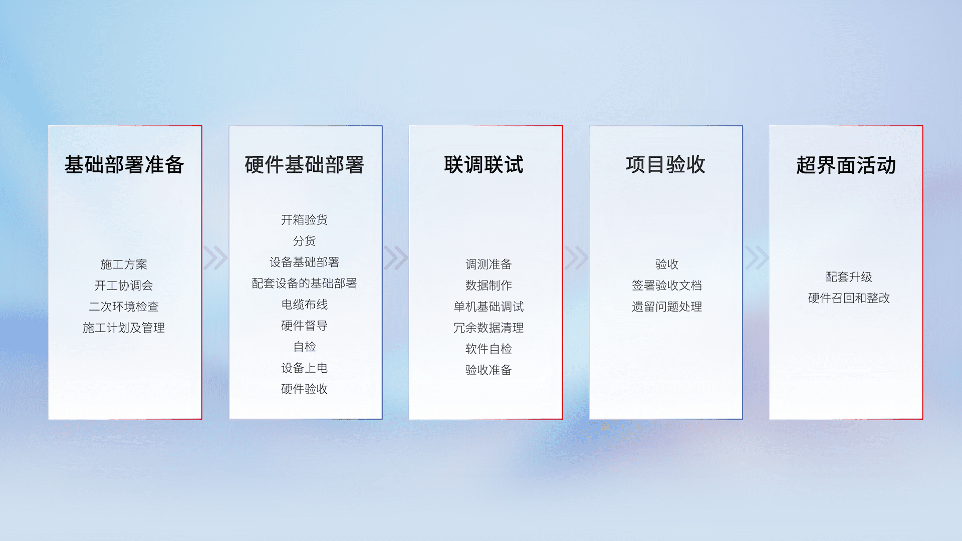从基础部署准备、、、、硬件基础部署、、、、联调联试、、、、项目验收、、、、越界面活动的全过程可追溯,,保证施工质量和进度。。。